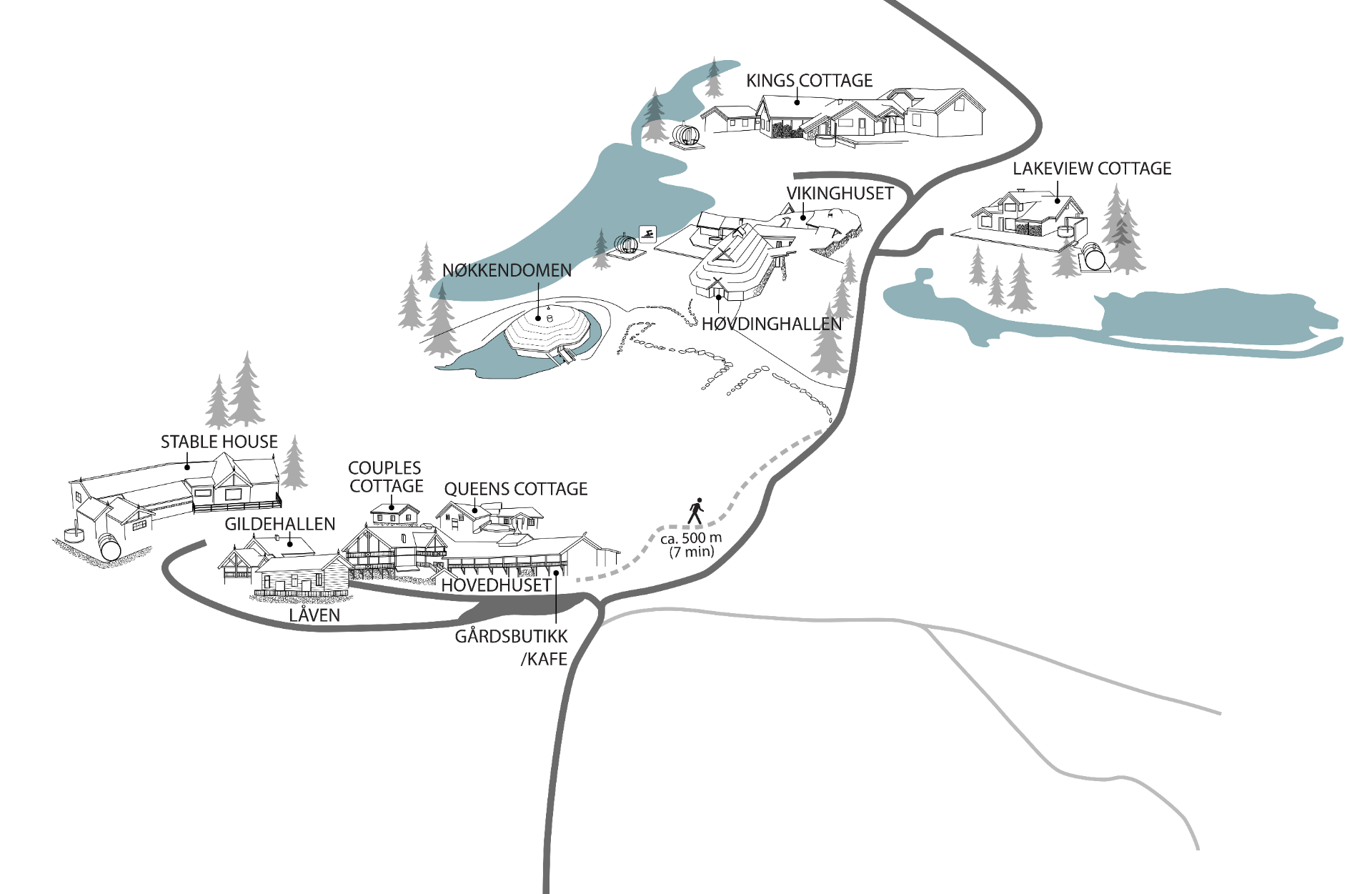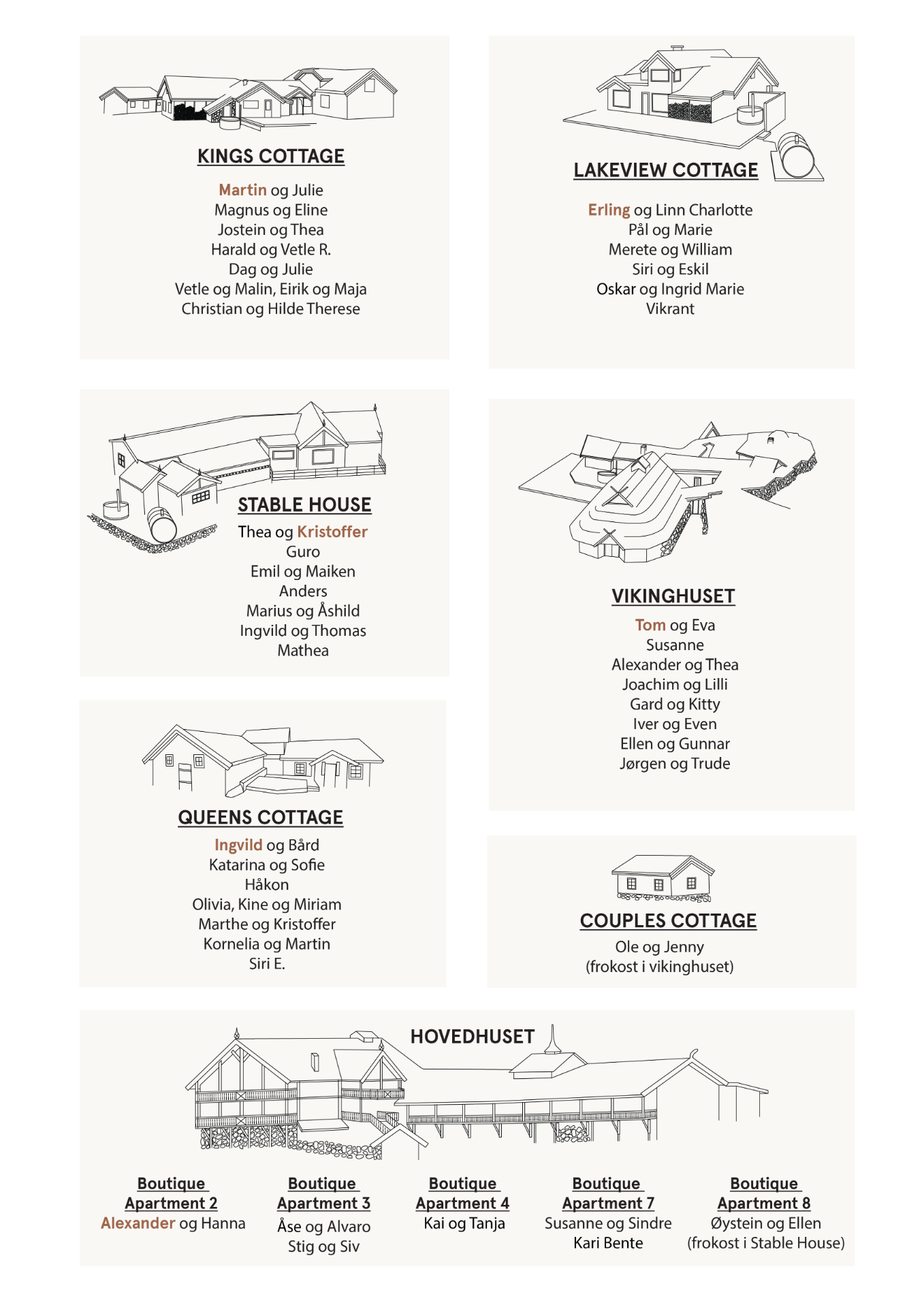 Under finner dere en oversikt over hytte-/leilighetsfordelingen for bryllupshelgen. Ved ankomst parkerer dere utenfor den enkelte hytte, eller på parkeringsplassen ved hovedhuset (for leilighetene). Det er ingen resepsjon på området, men nøkkelen står i døren, og navnet ditt/deres står på døren på hvert enkelt rom. Det er utpekt en hytteansvarlig (brun markering) for hver enhet som har som oppgave å hente ferskt brød og bakevarer til sin enhet på lørdag morgen mellom kl. 9-10. For Couple Cottage og Boutique Apartment 8 vil frokosten være tilgjengelig i Vikinghuset og Stable House. Mer informasjon vil bli kommunisert til hver enkelt hyttevert.